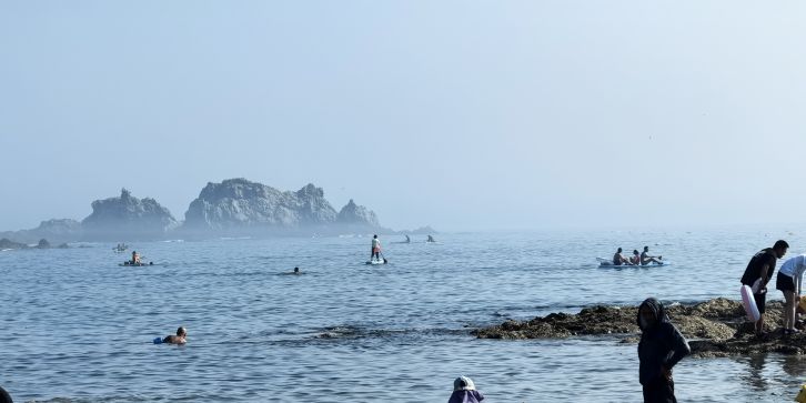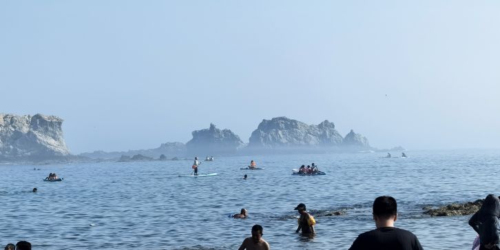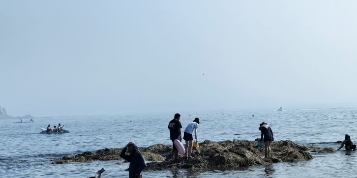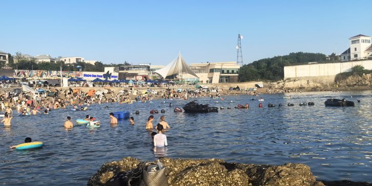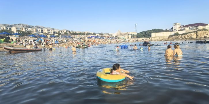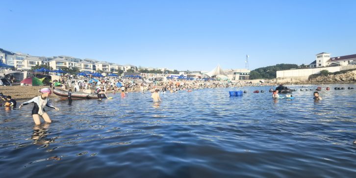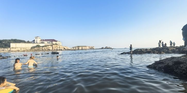 位于中山区滨海东路,地处滨海路东段,与棒棰岛景区紧邻,距市中心 7.5 公里,砂质岸线,A 类公共浴场型,全年全天开放。浴场海岸线长 220 米,沙滩上的沙子呈金色,沙质细腻,踩上去软绵绵的,海水清澈,颜色丰富,从远处的深蓝,到中间的蓝绿色,再到近处的清澈透明一眼见底,宛如 “果冻海”,沙滩两侧分布着礁石,形态各异,为海滩增添了几分独特的景致,也为赶海提供了良好的条件。退潮之后,沙滩两侧的礁石区域会露出水面,游客可以在这里抓到小螃蟹、海蛎子、海虹、花蚬子等,尽情体验赶海带来的乐趣。由于海水较深,适合开展桨板等水上运动,吸引了不少水上运动爱好者前来一展身手。设有更衣淋浴的沙滩服务中心,提供寄存服务,方便游客更换衣物和存放物品。
