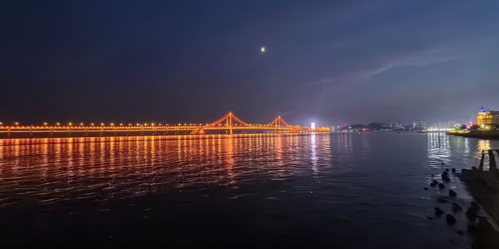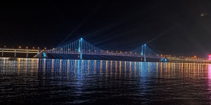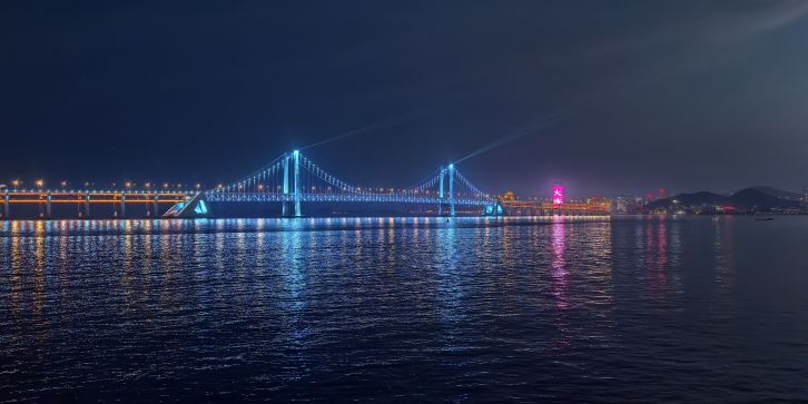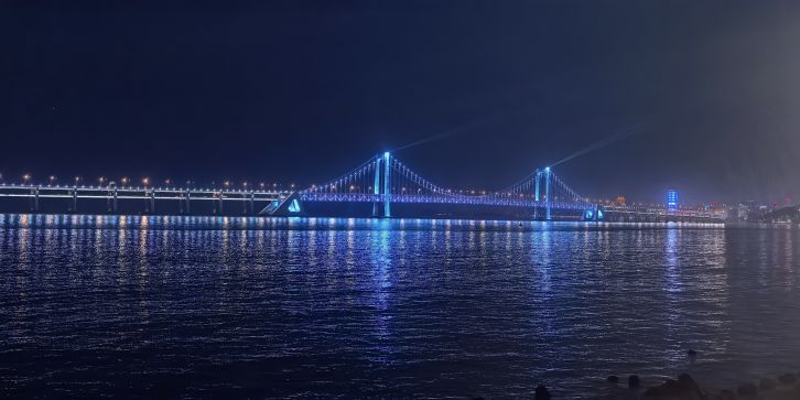 国内首座海上设重力式锚碇悬索桥、国内首座双层通车钢桁架悬索桥、国内最长的海上双层桥梁等。世界上首座采用抛石升降沉箱基础施工的桥梁,以及世界上首座采用预制架设施工的、上层桥梁采用主梁与横梁固结、横梁和桥墩之间设置支座的预应力混凝土桥梁。横跨黄海,在海上形成 S 形曲线,主桥正对星海湾广场中轴线,与周边的大海、城市建筑等共同构成了一幅美丽的画卷,尤其是夜晚的灯光秀,更是为大连的夜景增添了一道亮丽的风景线。