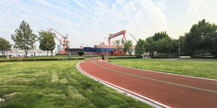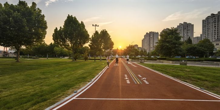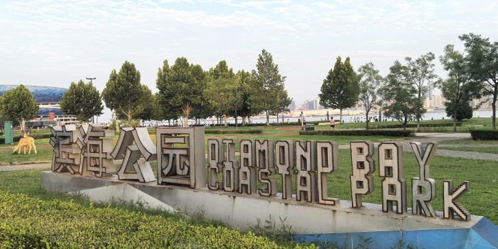 南面向海,是春柳河与周水河的入海口,因咸淡水交汇、梭鱼等水产资源丰富,加之海湾形似梭鱼,故而得名 “梭鱼湾”。公园位于甘井子区梭鱼湾专业足球场西侧,是一个集生态修复、运动健身、滨海景观与足球文化于一体的综合性公共空间。梭鱼跑道占地 4066 平方米,全长 800 米,宽 5 米,采用红色塑胶铺装材质并配有打卡点位和互动图文。跑道勾勒出一条巨大的梭鱼造型,鱼嘴正对着一颗 “夜明珠”—— 白天是黑白相间的足球雕塑,入夜则幻化为流光溢彩的光源。