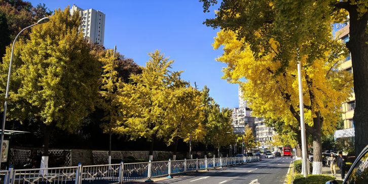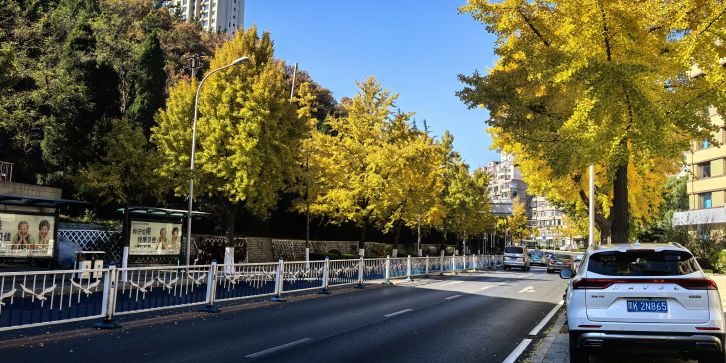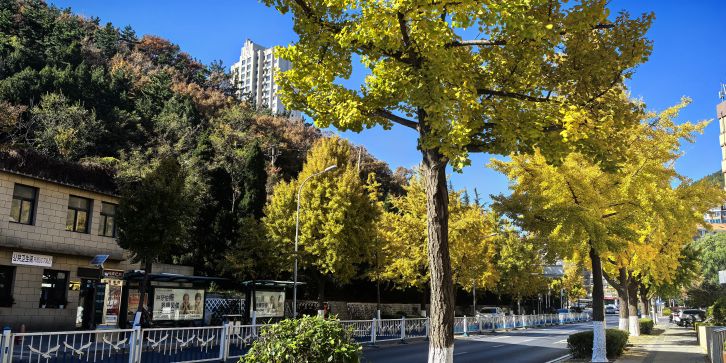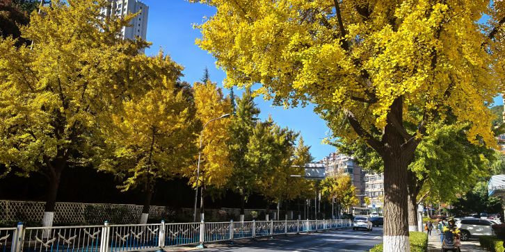 全长 1990 米,道路规划红线宽度 36 米,为双向 6 车道,是服务两侧地块的交通集散通道,与五四路、中山路、黄河路等东西向主干路相交。长春路的树木种类丰富,以银杏树为主栽树种。银杏树外形美观,适应性强,春夏叶子呈翠绿色,秋季变为金黄色,为街道增添了四季分明的美感。此外,长春路两侧还栽种有樱花树、法国梧桐、国槐等以丰富绿化层次。樱花树多作为点缀,春季粉白色花朵盛开,营造出浪漫氛围。法国梧桐树冠大荫浓,能为行人提供良好的遮阴效果。国槐则具有耐旱、抗寒的特性,与其他树木搭配形成多样化的生态景观。